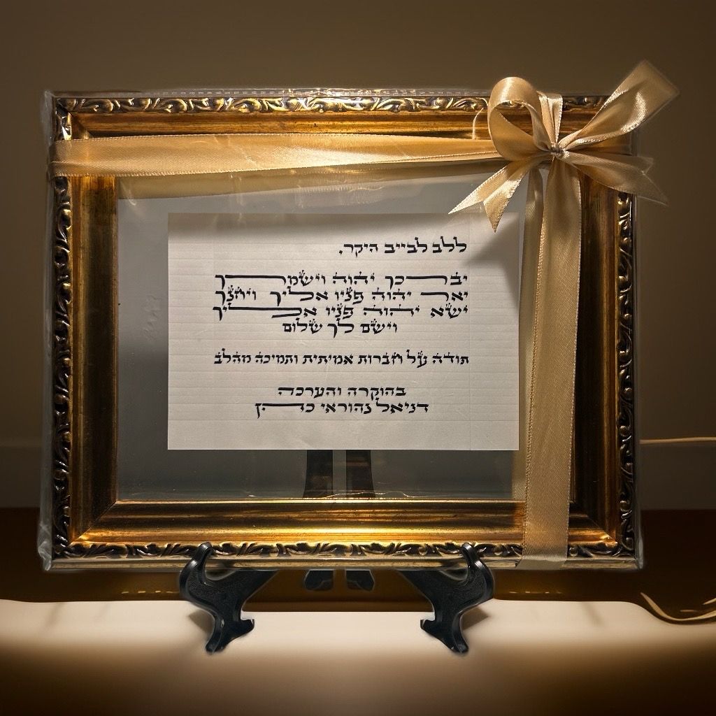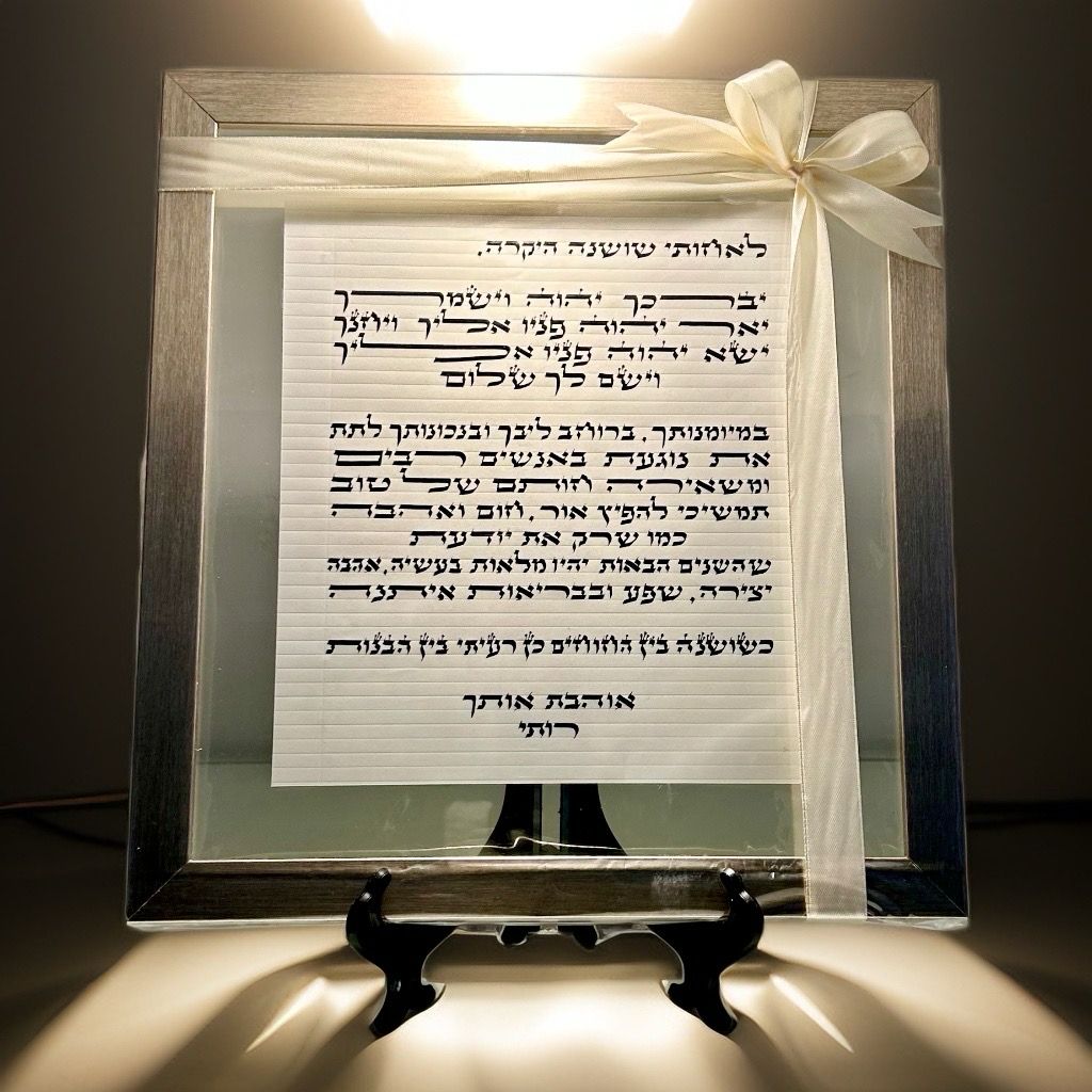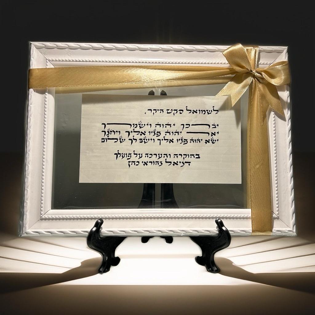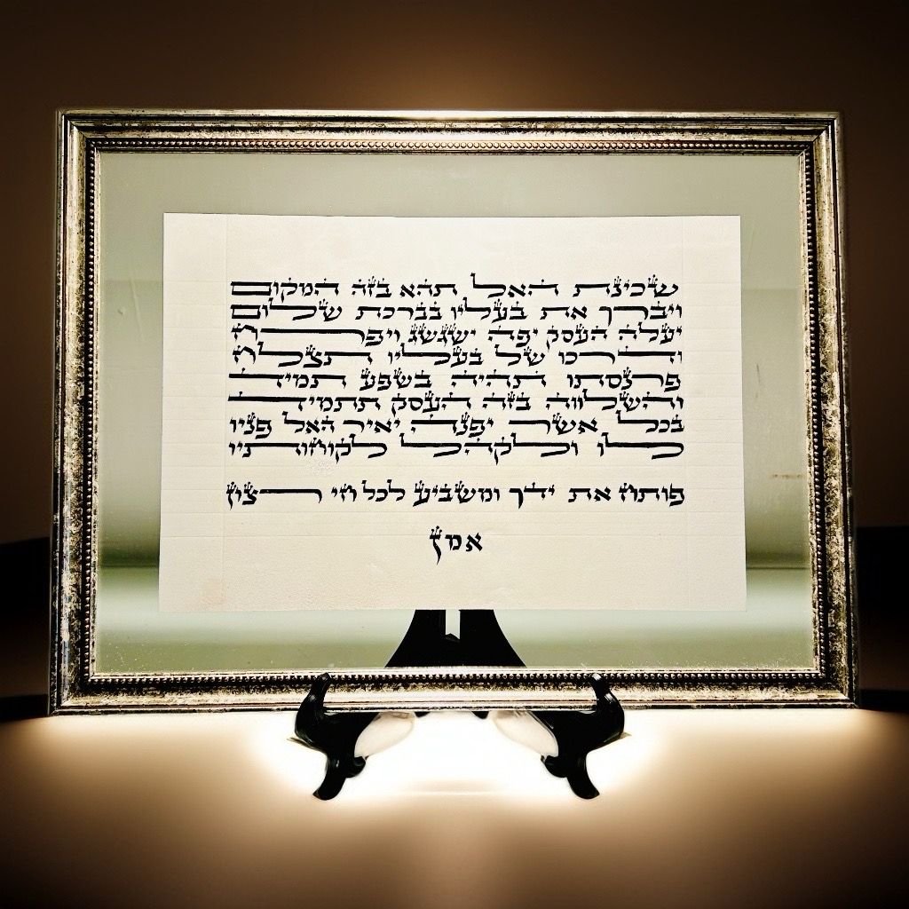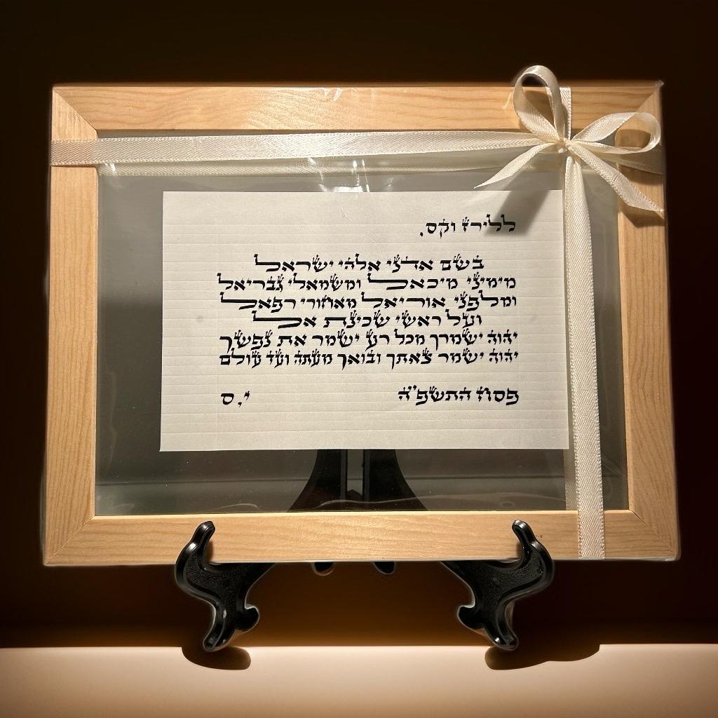 מלבד כתיבה של מזוזות, מגילות וספרי תורה, יצרתי מתנה אישית, שימושית ומרגשת שמשאירה רושם משמעותי אצל המקבל – כתיבה ממוסגרת אישית.