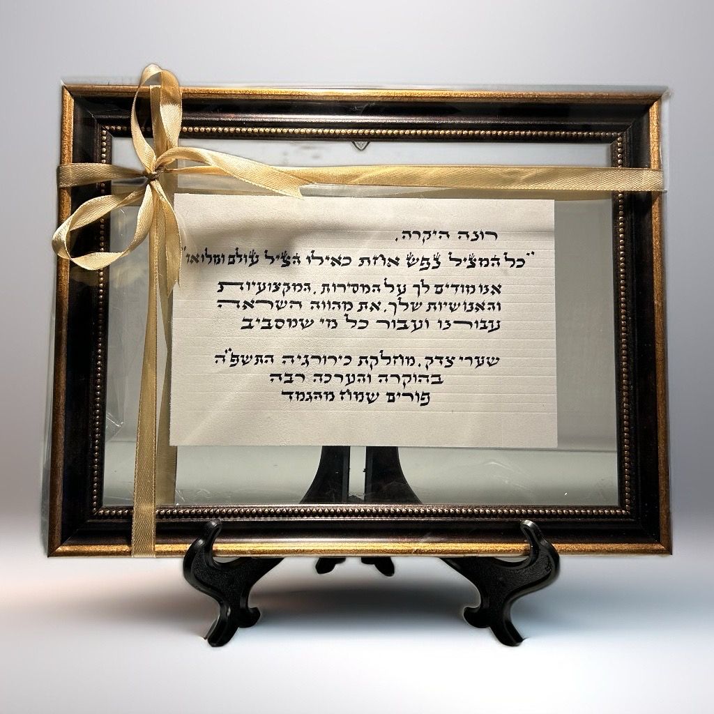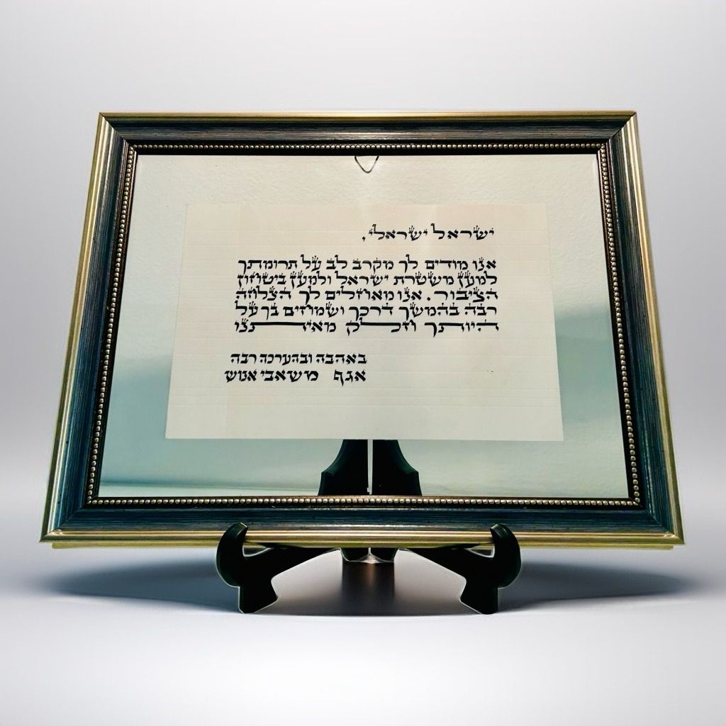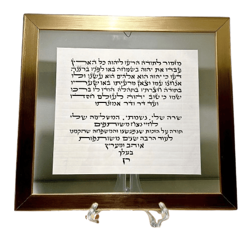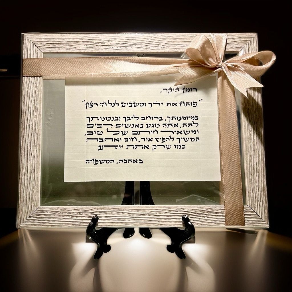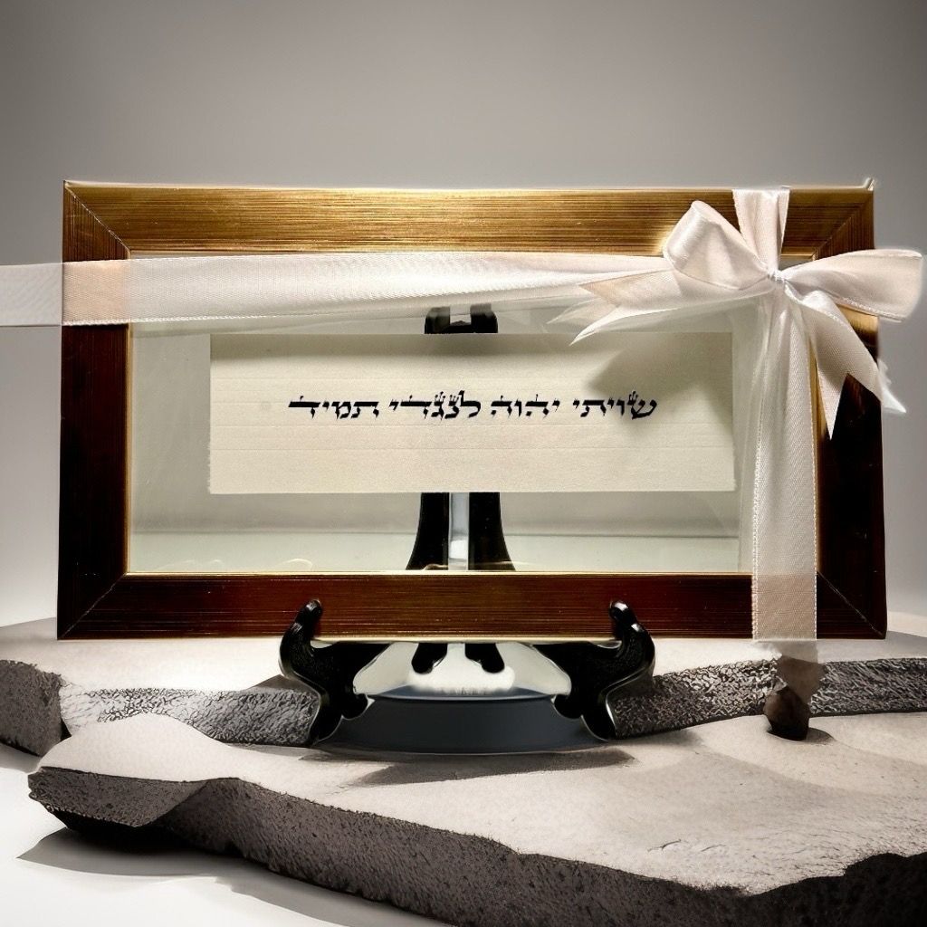 מלבד כתיבה של מזוזות, מגילות וספרי תורה, יצרתי מתנה אישית, שימושית ומרגשת שמשאירה רושם משמעותי אצל המקבל – כתיבה ממוסגרת אישית.